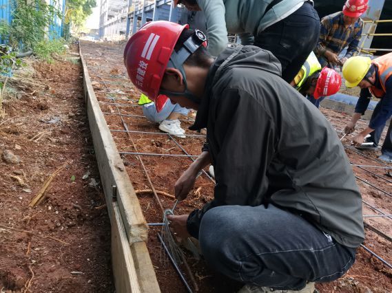 下(xià)午4點,10名管理(lǐ)人(rén)員(yuán)及4名班組長(cháng)對(₩→duì)現(xiàn)場(chǎng)環場(chǎng)道(dào)路(lù)B1區≤&"(qū)-C6區(qū)段進行(xíng)基礎鋼筋綁紮,因為(wèi)管理(lǐ)人(r>β→én)員(yuán)不(bù)熟悉綁紮工(gōng)具,動作(zuò)生(£≤shēng)疏,看(kàn)著(zhe)大(dà)家(jiā)®$“笨拙”的(de)模樣,班組長(cháng)決定對(duì)管理(↔&∞lǐ)人(rén)員(yuán)進行(xíng)實操教學。班組長(cháng)在現(xiàn)場(chǎng)對(duì)鋼筋擺放(fàng)及搭接長(cháng)度要(yào)求和(hé)紮鈎與紮絲§©β 的(de)使用(yòng)進行(xíng)了(le)教學後,管理(lǐ)人(rén)員(yuán)便拿(ná)起紮鈎操作(zuò)了(le)起來(¶αlái),大(dà)家(jiā)邊做(zuò)邊討(tǎo)論怎樣能(néng)夠綁紮得(de)快≠↕♦≠(kuài),綁紮得(de)緊密,在不(bù)斷地(dì)總結與分(fēn)享中,大(±>dà)家(jiā)捆紮、固定鋼筋的(de)手法漸漸熟練起來(lái)。終于在大(dà)家(j¶★♣iā)的(de)共同努力下(xià),一(yī)小(xiǎo)時(shí)完成了(l§≈÷ e)總長(cháng)100米的(de)道(dào)路(lù)鋼筋綁紮,并于當天晚上(shàng)澆築完畢。